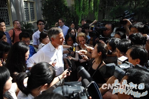 8月22日下午,美国新任驻华大使洪博培在北京美国驻华使馆新闻处举行的媒体见面会后,被众多媒体采访。中新社发 侯宇 摄