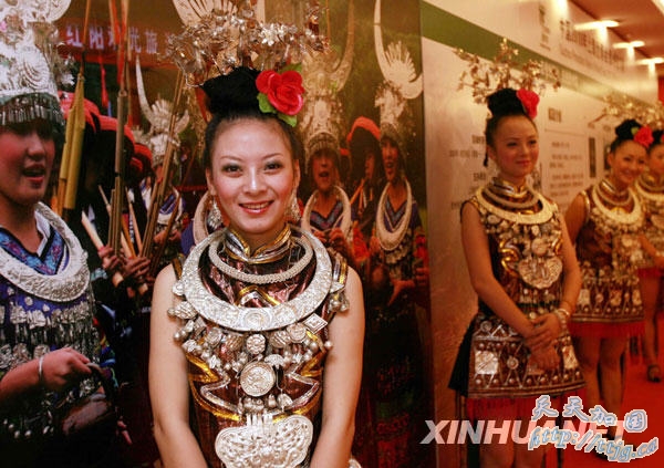 8月24日,苗家姑娘在上海世博会“贵州推广周”活动上盛装迎宾。