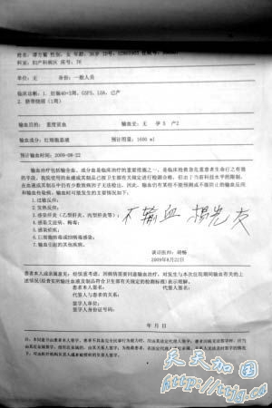杨光友在输血协议书上签字“不输血” 图片来源:重庆时报
