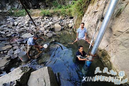 8月29日,遭遇干旱的湖南凤凰县千工坪乡组织村民深入溶洞抽取地下水开展抗旱自救。