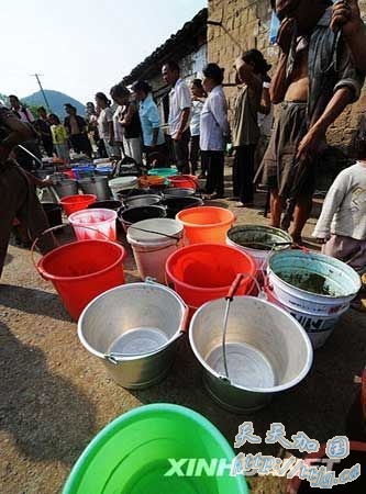 8月29日,遭遇严重干旱的湖南湘西凤凰县千工坪乡建塘村村民排队等候领水。新华社记者 龙弘涛 摄