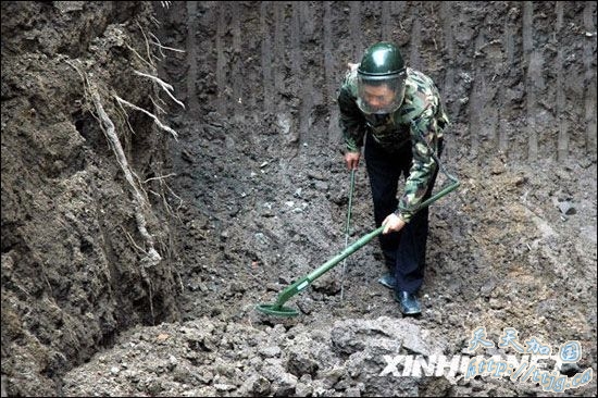 8月28日,排爆专家在河南郸城一建筑工地用探雷器探测炮弹。