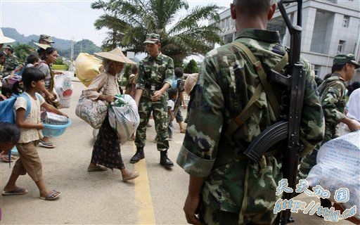 日前,缅甸果敢局势趋于平稳,在南伞的边民开始陆续回国。此前,靠近中国云南省的缅甸果敢地区发生战事,引发缅方边民恐慌并大量涌入中国境内。图为8月31日,一名行动不便的缅甸老人在中国边防武警战士的帮助下通过中缅边境南伞口岸。 中新社发 刘冉阳 摄