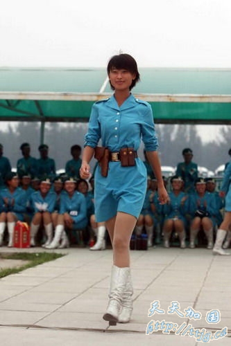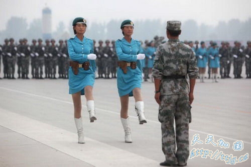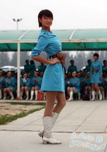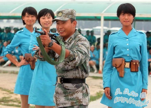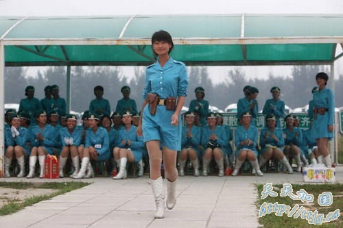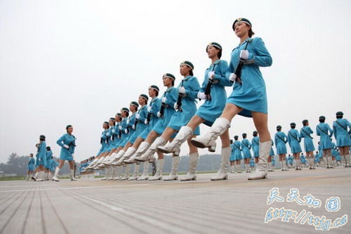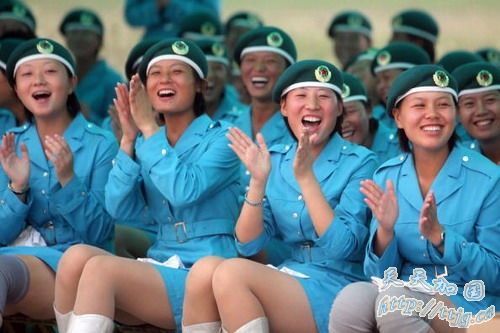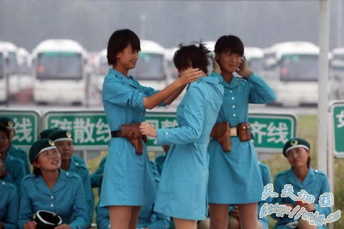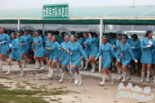 环球网9月9日报道2007年9月7日,参加国庆阅兵的女民兵方队队员们在训练间隙进行休息,表演一些小节目。