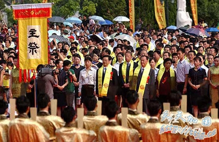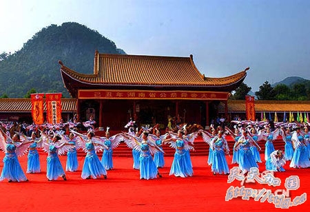 在一段由400多名青年男女演绎的告祭乐舞之后,毛致用、国家部委有关领导、省领导,以及来自九嶷山舜帝陵基金会、云南、江西、山东、陕西、台湾的代表等,分别向舜帝铜像敬献了花篮,匍匐在始祖归葬的这方圣土上,燃上一炷香,献上自己无尽的思念。来自四面八方的人们再一次感受到了中华民族源远流长的文明古风。