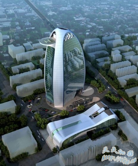 建筑从三个“角”上以外凸浑圆的巨大钢柱沿弧线直接交汇到楼顶,三面的玻璃幕墙则是内凹的曲面,整个造型简洁,并且十分节约造价。