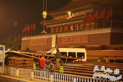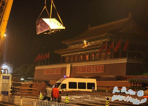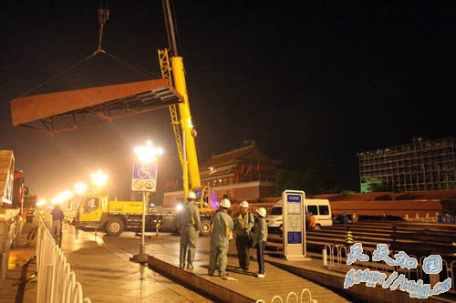 2009年9月9日凌晨,在北京天安门城楼前,工人正在吊装临时观礼台的台阶。