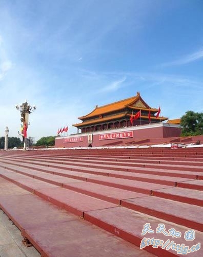天安门城楼两侧观礼台前搭建起了数百平方米的临时观礼台。