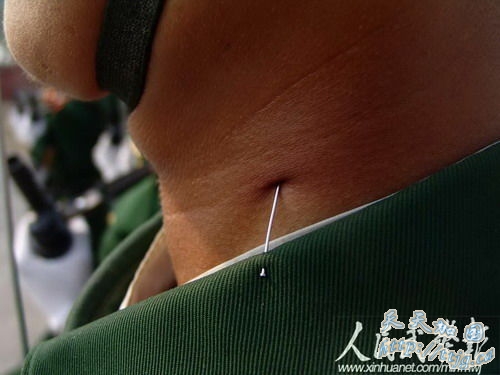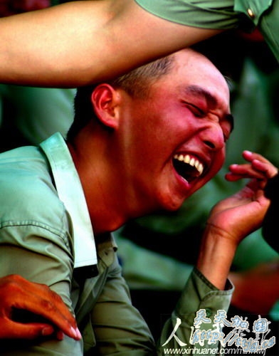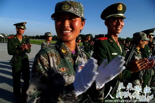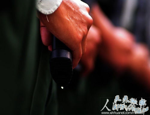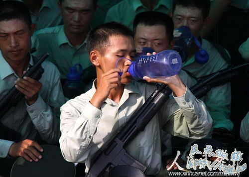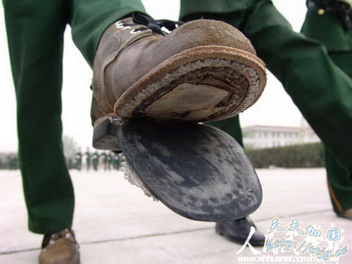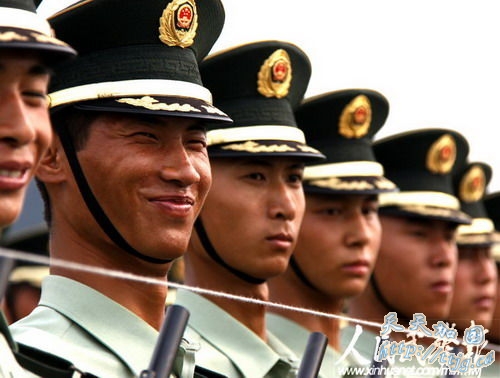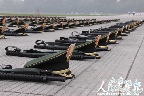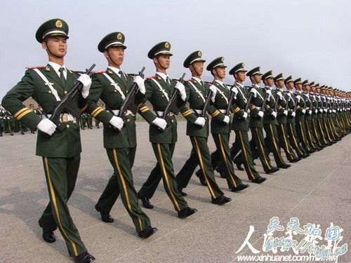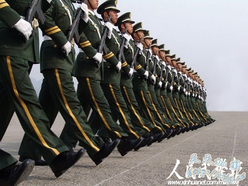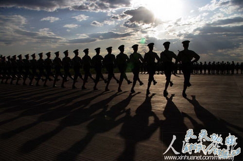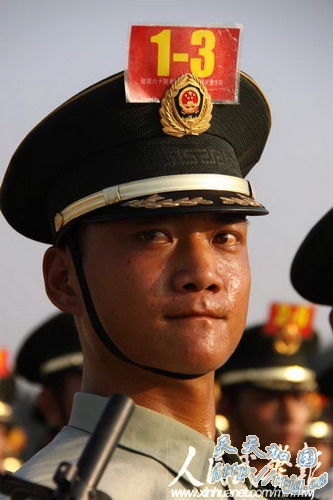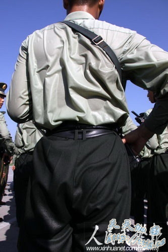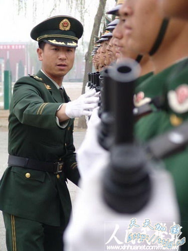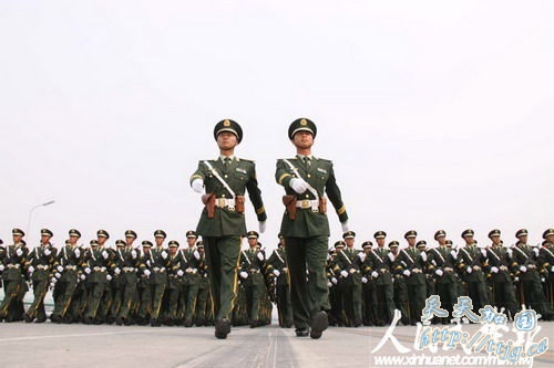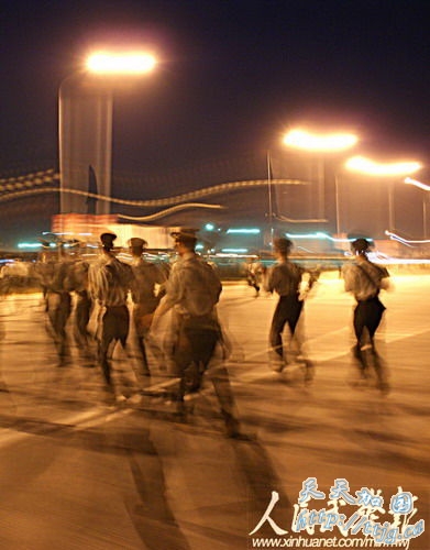 新华网9月11日报道 10月1日的国庆60周年阅兵中,武警方阵将以威武的姿态通过天安门广场,接受检阅。目前他们正在紧张的冲刺阶段训练中。