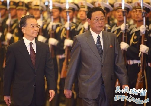 资料图:今年3月18日,温家宝在北京举行仪式,欢迎朝鲜内阁总理金英日访华。