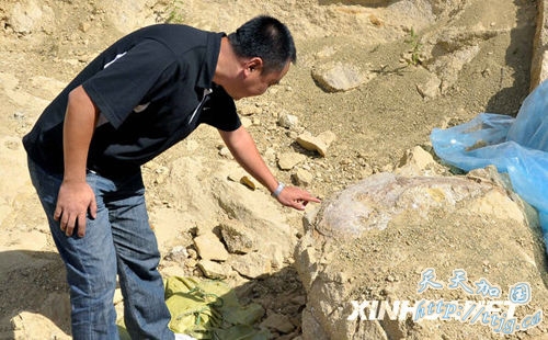 9月13日,工作人员在霸王龙化石出土现场发现了另一只大型恐龙的腿骨化石。新华社记者张小龙摄