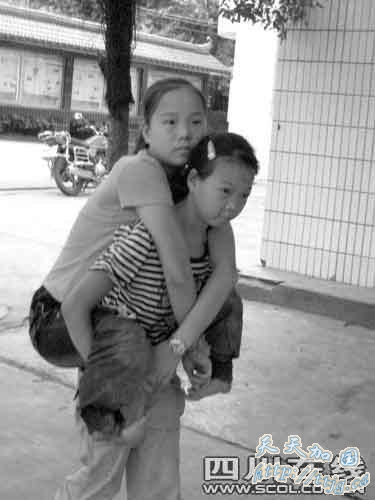 昨日上午第三节课下课铃声一响,初三一班的王琴就赶紧跑出教室,来到初三三班教室,走到姐姐王利面前:“姐,走,我背你上厕所。”其他同学主动腾开位置,只见瘦小的王琴蹲下半个身子,微胖的姐姐王利努力将双手放在妹妹的双肩上,妹妹用双手托起姐姐的两只大腿,然后甩开了大步。
