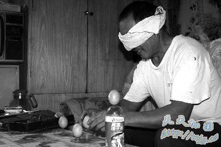 齐鲁晚报东营9月21日报道 因为曾有过被江湖医生骗过的经历,山东广饶县一61岁的农民苦练竖鸡蛋的本领,如今他不仅能将鸡蛋成功竖起,还练出了蒙着眼睛将鸡蛋竖在灯泡上的绝活。