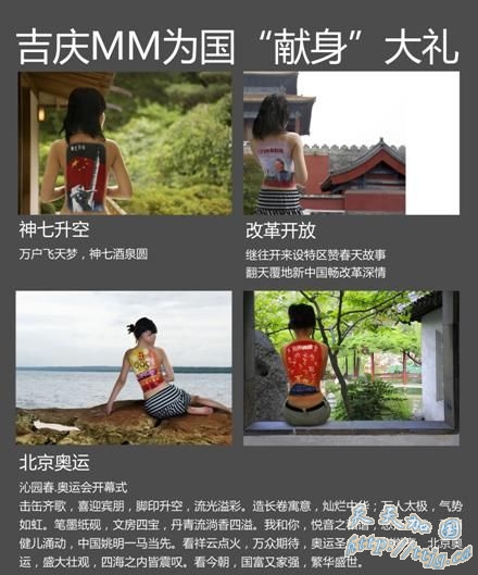 信息时报9月24日报道 国庆60周年前夕,网上处处涌动着另类爱国热潮。继百语吟诵爱国诗歌《我爱我的祖国》、视频热播天安门版发型、网友创作许仙和白娘子深情对唱“爱祖国”视频之后,近日,一名被众网民封为“吉庆MM”的90后女孩,用“裸背”展示数幅寓意祖国光辉成就的彩画,仅数小时论坛的点击率逾二十多万。网民对此事件褒贬不一,并称之为“裸背门”。