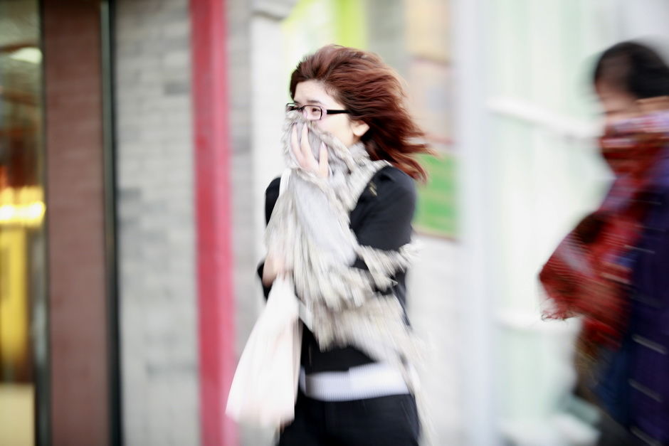 2009年10月18日,北京北方大风降温,行人风中艰难行走。