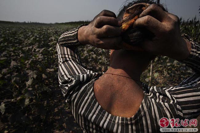在山西临汾市污染严重地区,农民在棉花地里干了两小时的活之后全身都是煤灰2007年9月24