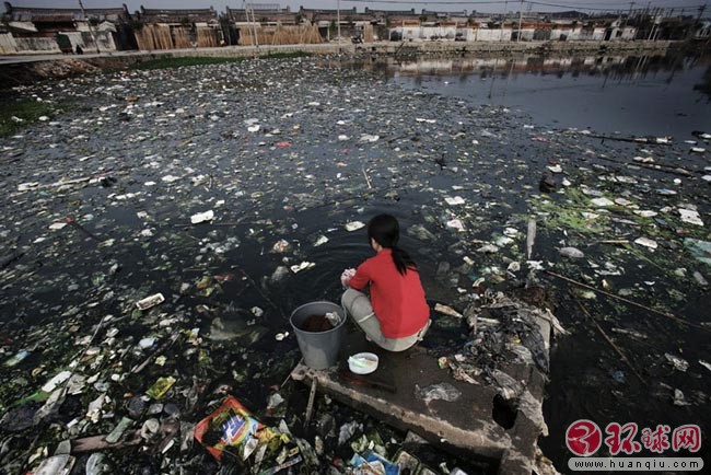 广东省贵屿镇河流、水塘都已被污染,村民们只好在被严重污染的水塘里洗涤 2005年11月25日