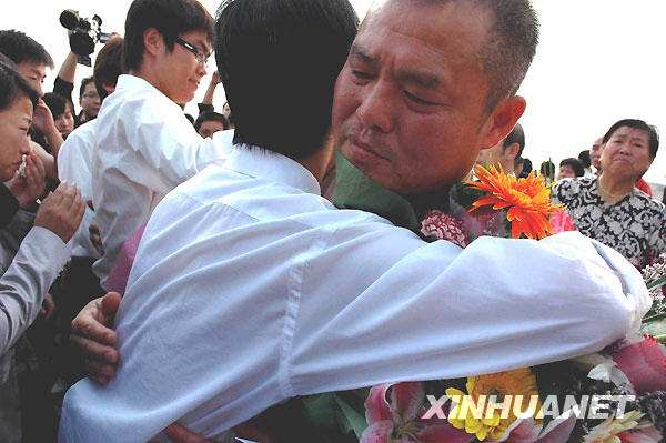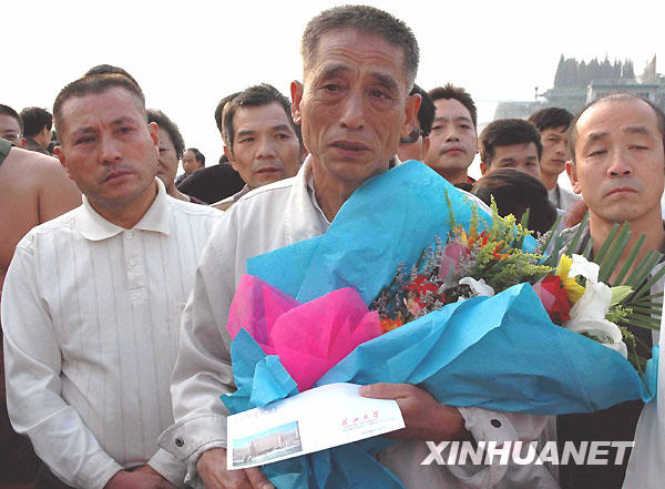 10月26日,长江大学学生与参与救助落水同学的宝塔湾冬泳队老队员拥抱以感谢他们的义举。新华社记者 魏梦佳 摄 10月26日,参与救助落水大学生的61岁宝塔湾冬泳队老队员鲁德忠接过学生们致谢的鲜花后潸然泪下。新华社记者 魏梦佳 摄