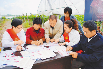图为农行工作人员在江苏句容市白兔镇张小虎葡萄合作社为农民发放惠农卡。戴舜水 封 波摄