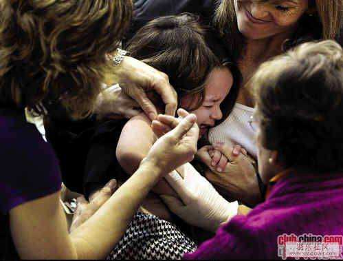 第六种:哭天抢地。前面几位中国mm的反应虽然不同,但是看了这个美国小女生打针的架势,想必楼上的几位中国女孩可都称得上是相当勇敢了!这美国小女孩反应也太大了吧,几个人才把她摁住,不就是打疫苗么。。。。汗