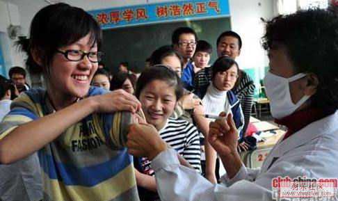 第二种:怯生生。小女生怕打针可以理解,因此也比较有代表性,所以某报把这张照片放到当日的头版大幅照片刊登,此女生的照片一天之内被发到了北京的大街小巷。