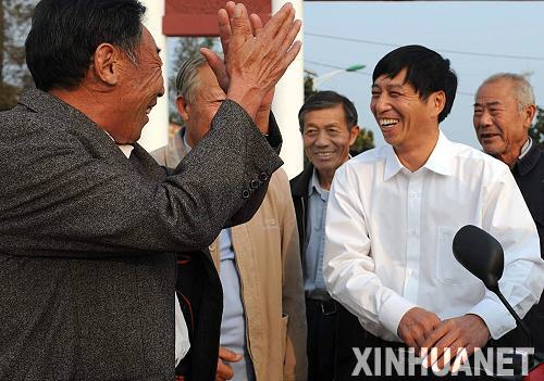这是2008年10月7日,小岗村新带头人、村党委书记沈浩(前右)与大包干带头人关友江、严俊昌、严金昌、严学昌交流小岗村的改革发展情况。 新华社记者 王雷 摄
