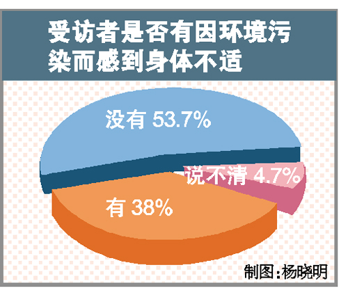 调查显示, 四成一的受访者表示近一年来“有”因为环境污染而感到身体不适,症状主要集中在“咳嗽”、“咽喉炎”、“烦躁”等呼吸和精神疾病方面。