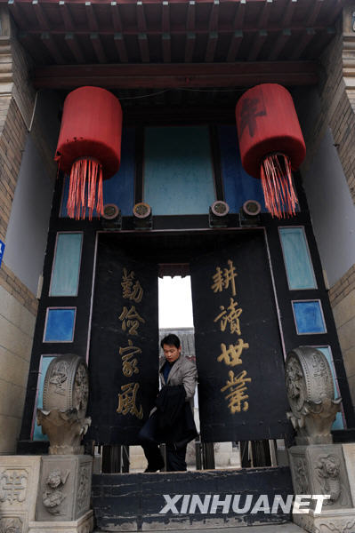 牟氏庄园的大门庄重、气派,黑漆大门上刻着“耕读世业 勤俭家风”的金色对联,两边石鼓精雕细琢(12月2日摄)。新华社记者 李紫恒摄