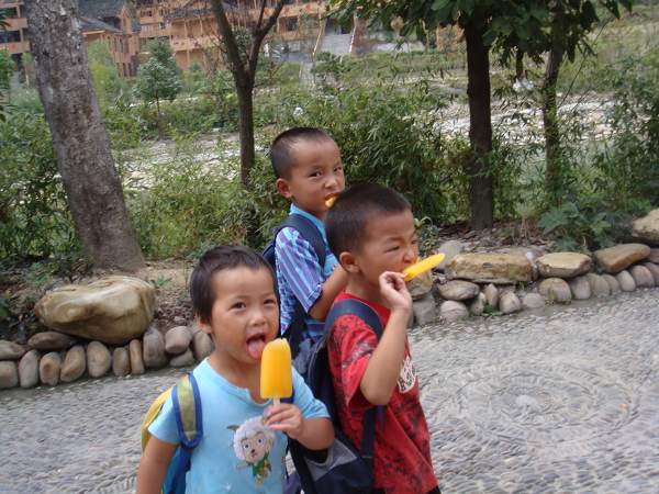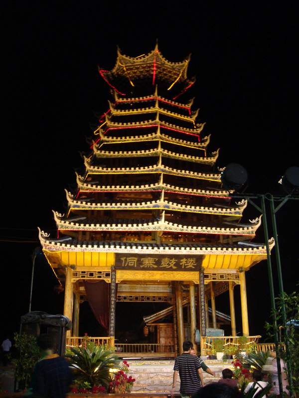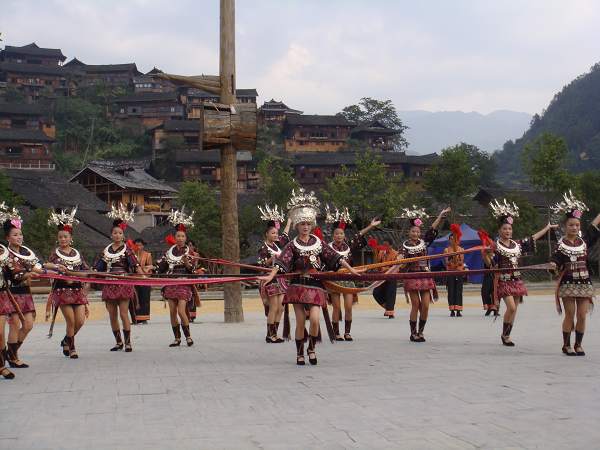 喝完酒我们上了小电瓶车开始游览千户苗寨。这千户苗寨真的是得天独厚,共有千余户人家坐落在群山之中。寨中有清溪穿寨而过,溪上横卧数座风雨桥。远处依山而建吊脚楼层层至山顶,最高处为苗王居所。寨子外侧有梯田无数,引泉水灌溉,稻谷芬芳。秋季正值收获,寨民们以最原始的方式在田间收割打谷。寨中每天下午两点有免费表演,但我们因为路上耽搁,演出团特地为我们加演了一场。少数民族的舞姿一般,但服饰却很有特色,尤其是一个表演者能用树上随便摘下的叶子含在口中吹奏出美妙的歌曲。我们大家看似简单,也把树叶放到了嘴里,可是即便脸涨成了猪肝,也是一点声音也发不出来。