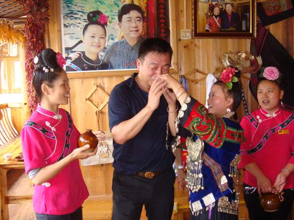 我们中午赶到千户苗寨去用午餐。快到时,主人在车上就提醒我们,苗寨人非常好客,他们敬的自酿米酒是没有停的。果然,车刚停好,全副盛装的苗家姑娘们就拥了上来,从下车酒开始,入门酒,上楼酒,歇息酒,饭前酒,饭间酒,饭后酒,下楼酒,再来酒,真的是没有停过。那自酿米酒酒精度数至少有30度左右,比起偶尔喝的葡萄酒来酒精含量可是要高多了。我们海外媒体一行人个个都被敬了7-8碗,而男士们被热情的苗家姑娘至少灌了18碗,都成了醉仙一般,不慎酒力的人还真顶不住。