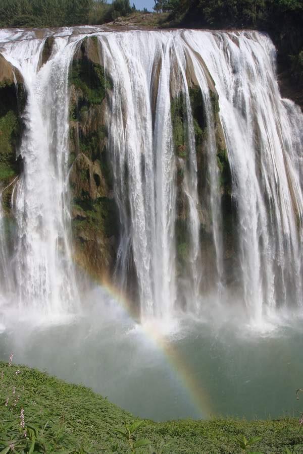 我们先到黄果树瀑布附近的天星桥景区,穿过了多姿的钟乳石岩洞后,又得以欣赏水中石林。然后乘车到了几公里外的黄果树公园的进口。原本以为在进口就能听见喧嚣的水声了,谁知竟然是静悄悄的。估计因为不是周末的原因吧,从进口进去穿过盆景公园,一路上游人都非常稀少。将近走了1公里多路,700-800米外的大瀑布豁然跃入眼帘。聆听着那奔流而下河水轰鸣声,遥望着溅落湖水中泛起的水汽在阳光下形成的七色彩虹,真是令人叹为观止。这时通往瀑布的小路分成了上下两条,我们在东道主的建议下选择了山上的小路。这条路把我们一直带入了瀑布的身后。原来在瀑布的后面有一个穿过瀑布的水帘洞,我们在水帘洞中被飞溅的水花淋的透湿。从洞口探头向下一看,天哪,千仞绝壁就在脚下。