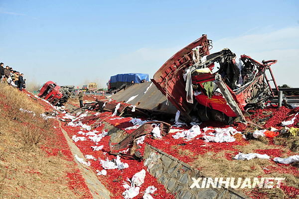 5日零时20分,装载黑火药的赣J17951大货车行驶至京珠高速湖北段1125KM处时,起火发生大爆炸,造成现场4人死亡,高速路面严重损毁, 附近2000多户房屋受损,29名村民受伤,经济损失近500万元。目前,货车司机刘偶善、吴跃萍及货主张平元均已被孝感警方刑事拘留。