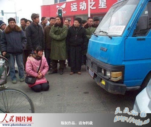 人民网12月11日报道 2009年12月10日,河南省开封市劳动路北段一位女子在路旁叫卖水果被城管人员查扣,该女子跪在地上哭哭啼啼地求饶,众人同情劝说,水果车最终得以放行。