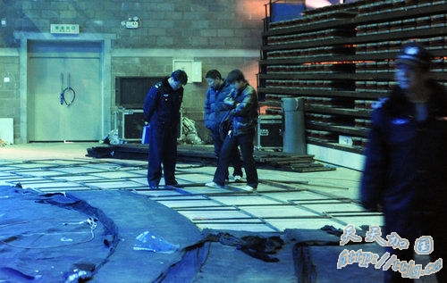 昨天上午记者赶到现场时,房山警方正在演播厅内进行调查,坍塌看台的金属架“平躺”在地上。中国信息大学的学生坐在舞台两边,等待继续录制节目。现场一名音像师告诉记者,他们在为中央电视台六频道《佳片有约》栏目录制节目。
