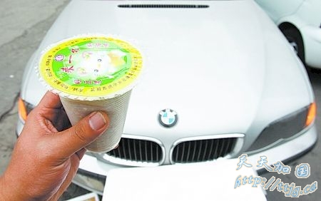 在一辆银白色宝马车前,放着一个白色泡沫箱。一个小伙子揭开箱盖,里头整整齐齐放着一排杯子,他拿出一杯递到小曾面前:“两块钱一杯,好吃得很,物超所值。”小曾正要吃早饭,便掏出两块钱,接过杯子。另一个小伙子赶紧递过一支粗吸管,看到小曾插不进去,便拿出刀子,在封口上划出一个口子,让他插吸管。