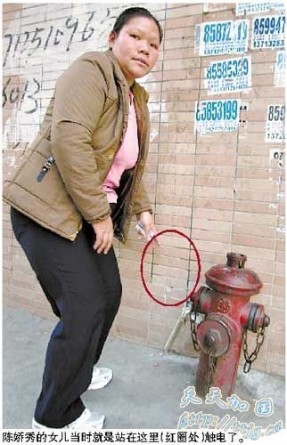 事情发生在12月19日下午1时多。陈娇秀带着两个孩子下来晒太阳。“我牵着女儿的手,她一步步地在墙壁边学走路;儿子跑远了,我就抬头去看儿子,让女儿扶着消防栓。就几秒钟,我回头看女儿时,只见她左手捏着墙壁边的电线,右手扶在消防栓上,嘴张着。”