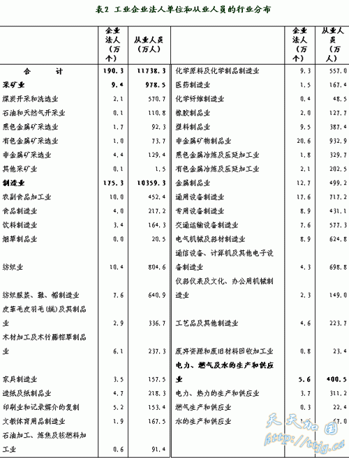 2008年末,全国共有工业企业法人单位190.3万个,从业人员11738.3万人,分别比2004年末增长31.2%和21.7%。工业有证照的个体经营户227.4万户,从业人员1402.7万人,分别比2004年末增长4.6%和3.8%。
