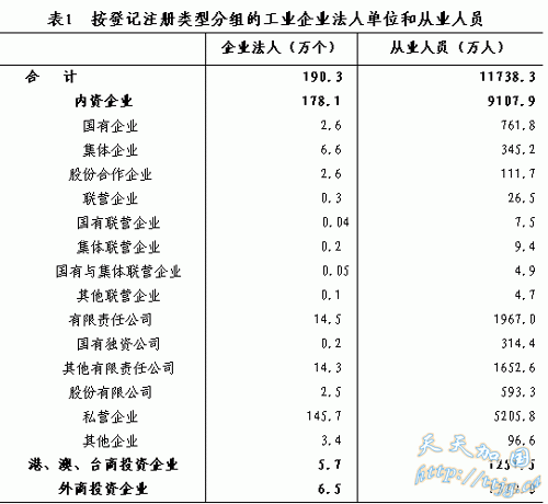 在工业企业法人单位中,国有企业及国有独资公司2.8万个,占1.5%;集体企业6.6万个,占3.4%;私营企业145.7万个,占76.6%;港、澳、台商投资企业5.7万个,占3.0%;外商投资企业6.5万个,占3.4%;其余类型企业23.1万个,占12.1%。