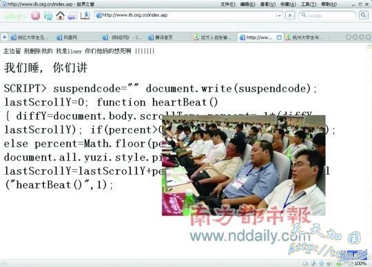 记者昨晚10时许登录该中心网站,点击中文版进入后发现,页面无法正常显示,取而代之的是一大串类似计算机程序语言的文字,以及一张此前网上广泛流传的官员开会睡觉的照片,并附一条调侃性的语句“我们睡,你们讲。”