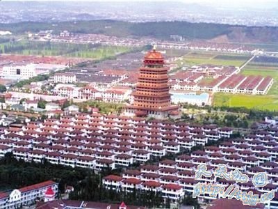 这个塔形的中式建筑,是华西村建村35周年的献礼作品,投资1.2亿,花费两年半时间建造,1996年竣工。