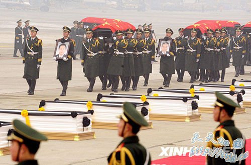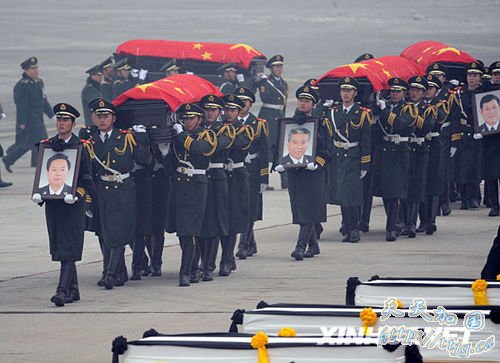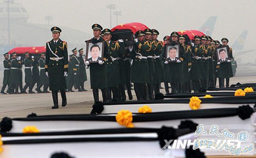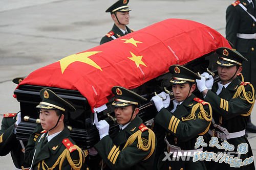 1月19日,礼兵护送八位烈士的灵柩,灵柩上覆盖着中华人民共和国国旗。当日,专程接运在海地地震灾害中遇难的八位中国维和警察灵柩的专机抵达北京首都国际机场。新华社记者张铎摄