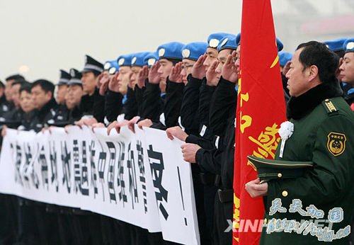 周永康说,2000年以来,我国先后向七个国家和地区派出维和警察1500多人次,同志们不怕牺牲、恪尽职守、纪律严明、作风过硬,展现了威武之师、文明之师、和平之师的良好形象,受到了联合国和驻在国民众的高度赞扬,为祖国赢得了荣誉,你们是中华民族的骄傲,祖国和人民感谢你们。