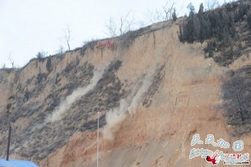 地震发生瞬间拍的照片,远处可见尘土向下滚