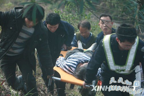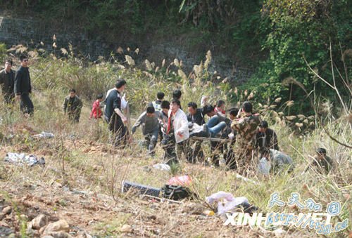 2月8日,救援人员在广西河池大客车坠落事故现场运送伤员。新华社发(莫限涛摄)