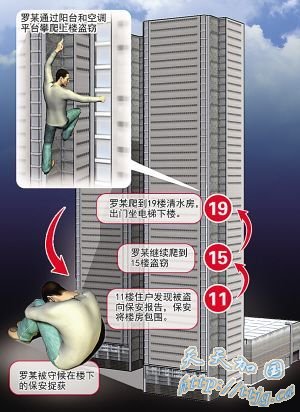 后经民警调查,罗某徒手攀爬到11楼偷了一家住户后,又攀爬到了15楼,拿着15楼住户客厅家的包到16楼的阳台上,翻出包里的现金。之后,罗又攀爬到了19楼,就从此房出门坐电梯下楼。 记者 罗彬