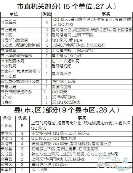 检查人员也发现一些不和谐之音。个别机关人员在上班时间串岗闲聊、上网聊天、炒股、打牌、玩游戏,被检查人员逮了个正着。如平阳县鳌江镇一副镇长中餐饮酒。