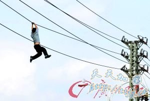 15时10分,男子急了,全身往旁边高压线一跃双手抓住一根高压线,双脚悬空,吓得周围的人暗暗为他捏了一把汗。