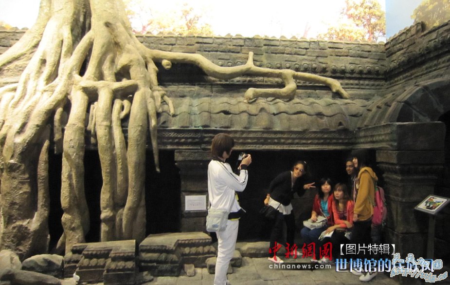 5月1日世博会开园首日,柬埔寨馆内复制的塔布笼寺大树成中国游客留影最多的场景。塔布笼寺那棵长在建筑中间的大树因为美国电影“古墓丽影”而被中国人所熟知。