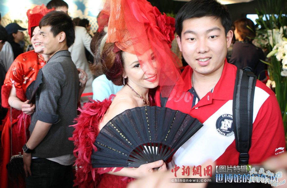 5月1日,上海世博会正式开园,在法国馆内,美丽的法国少女热情地接待着每一位进馆参观的游客。图为法国美女与中国小伙“亲密接触”,尽显法兰西浪漫风情。
