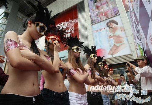 8日下午,在广州岗顶一百货公司在其门口策划了一场“挑战吉尼斯单手解内衣”大赛,参赛选手只要在一分钟内单手解开8位模特身上的内衣扣环,就有机会获得一份大奖。一位女选手21秒解下8件内衣夺冠。